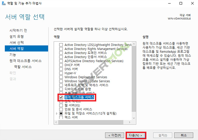 3) 서버 역할 부분에서 원격 데스크톱 서비스 를 선택 후 다음을 눌러 진행 합니다.