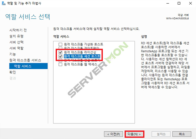 5) 역할 서비스 선택에서 '원격 데스크톱 라이선싱', '원격 데스크톱 세션 호스트' 를 선택 합니다.