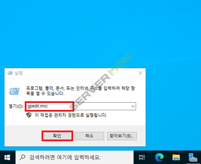 2) 실행 창이 활성화 되면 gpedit.msc 를 입력하고 확인을 눌러 로컬 정책 편집기를 실행 시킵니다.