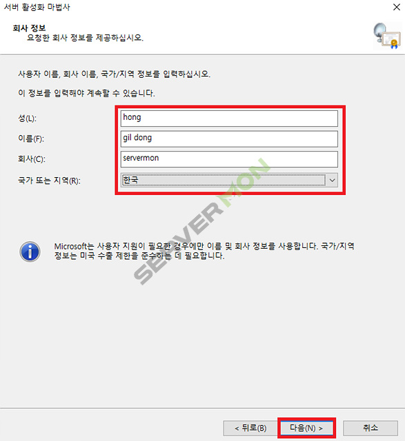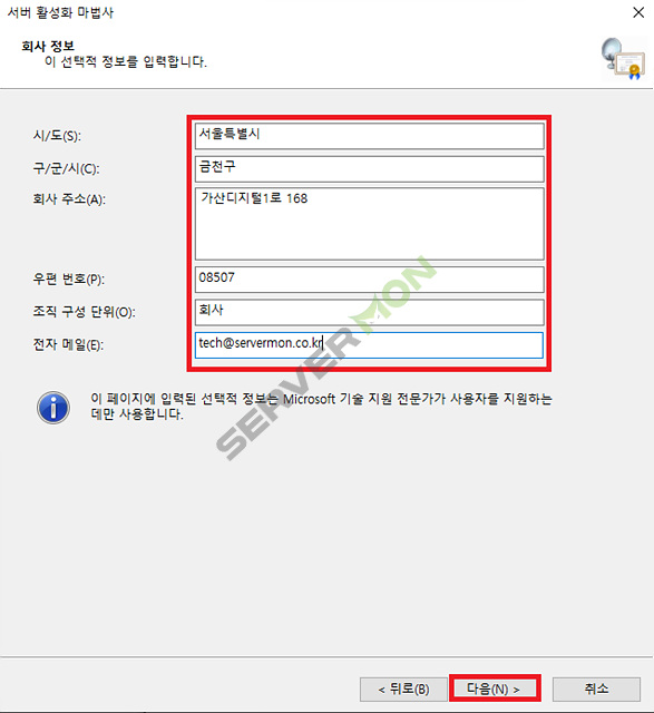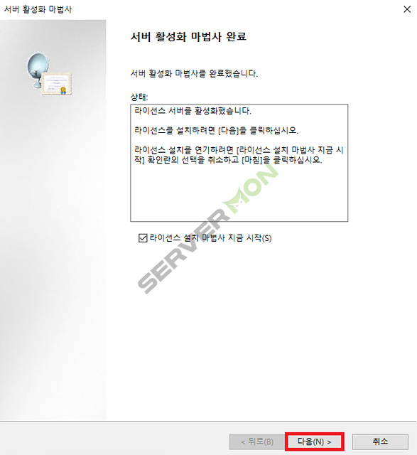 4) 추가적인 정보들을 입력하고 완료하면 서버 활성화 마법사가 완료 됩니다.