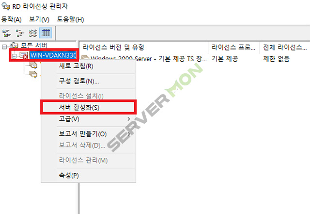 2) 실행 후 해당 서버를 선택하고 마우스 우클릭하여 서버 활성화 옵션을 선택 합니다.