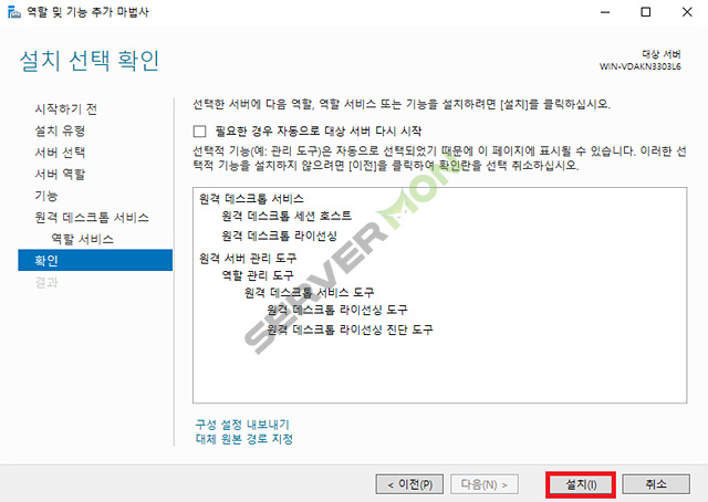 6) 설치 선택에 대해 확인 하고 설치를 눌러 서비스를 설치 합니다.
