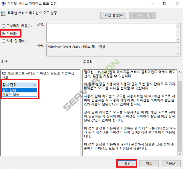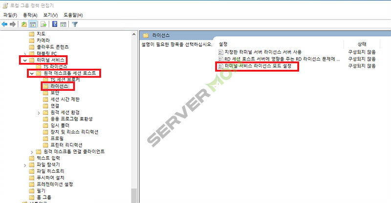 3) 컴퓨터 구성 > 관리 템플릿 > Windows 구성 요소 > 터미널 서비스 > 원격 데스크톱 세션 호스트 > 라이선스