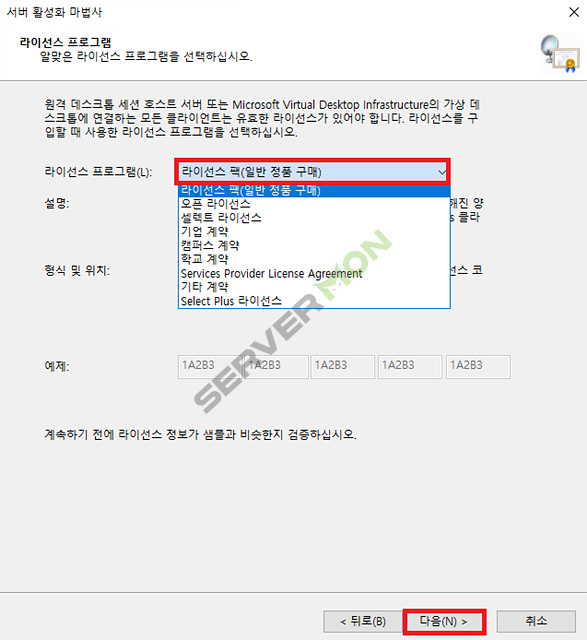 6) 라이선스 프로그램은 기본적으로 라이선스 팩으로 선택되어 있습니다. 그 외의 환경이라면