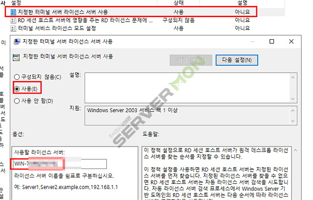 5) 지정한 터미널 서버 라이선스 서버 사용을 실행 합니다.