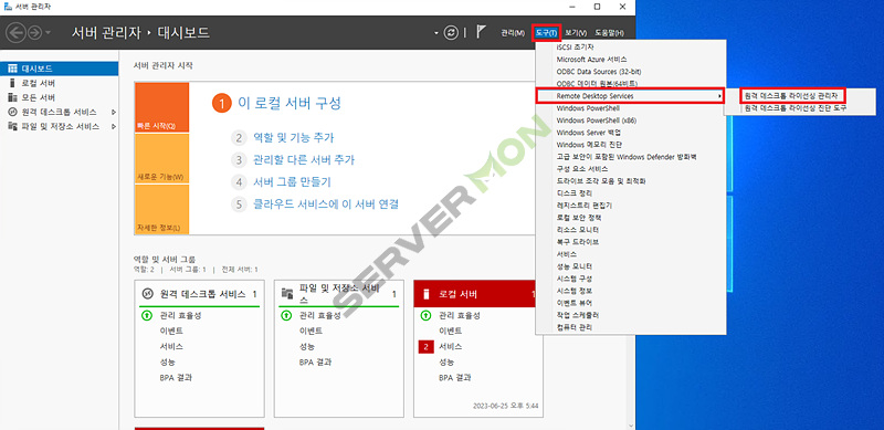 1) 서버괸리자 > 도구 > Remote Desktop Services 항목에 보면 원격 데스크톱 라이선싱 관리자를