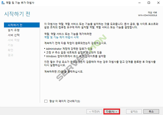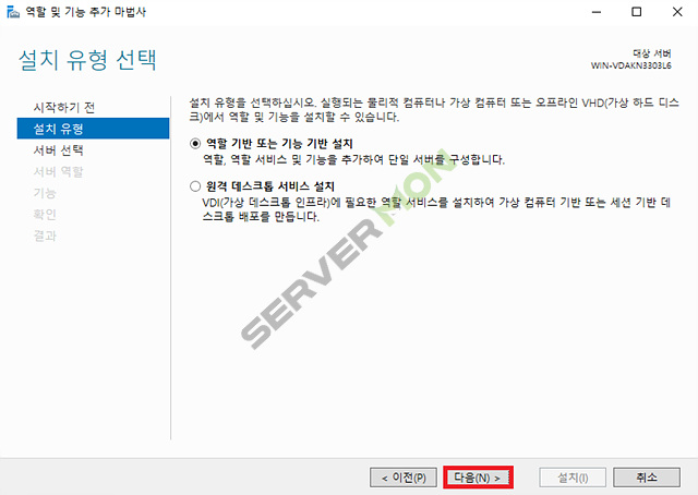 2) 서버 역할 선택 항목이 나올때까지 '다음' 버튼을 눌러 진행 합니다.