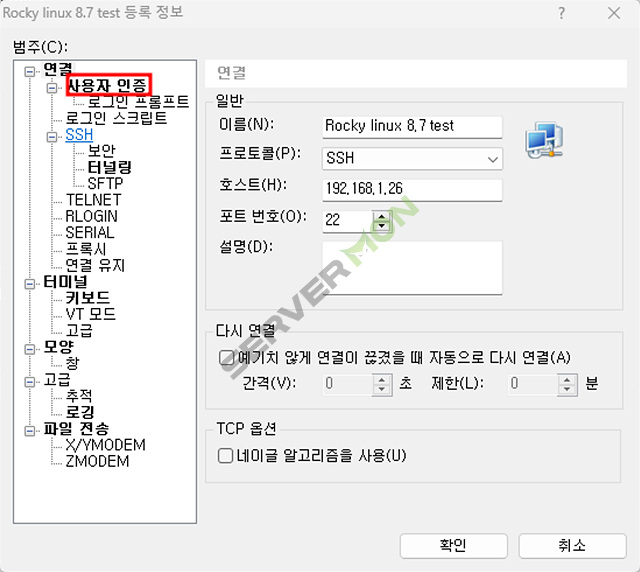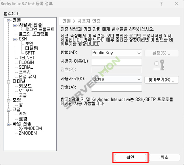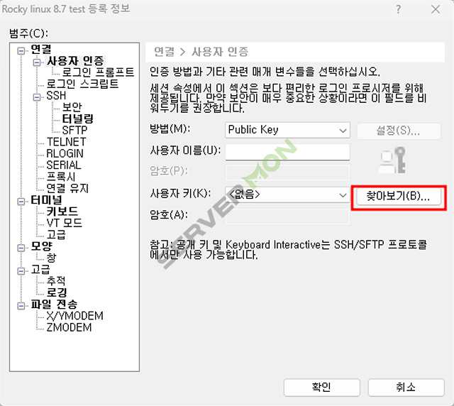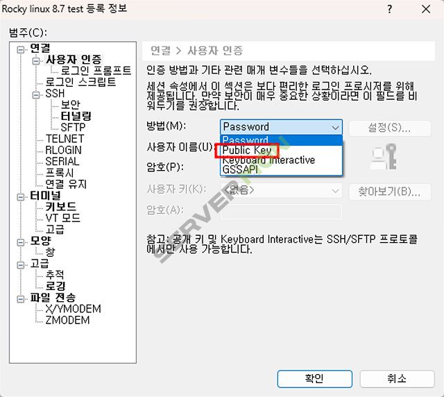 Xshell 에서 접속하려는 서버의 등록정보 에서 사용자 인증으로 들어갑니다.