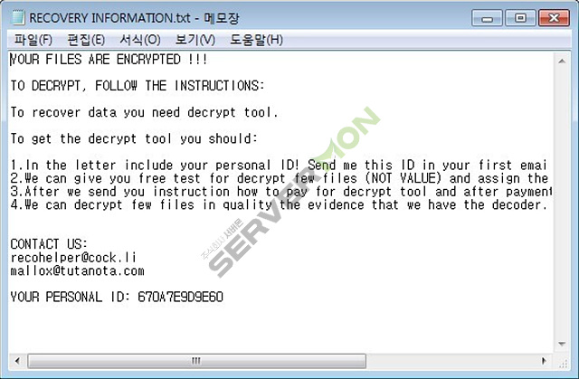 랜섬노트의 내용은 대부분 영어로 되어있고 "당신의 파일이 암호화되었고 우리의