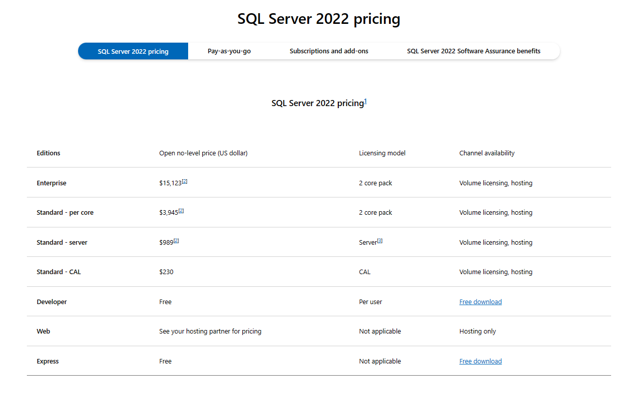 - MS SQL Server 2022 를 기준으로 아래와 같이 구매하실 수 있는 종류가 있습니다.