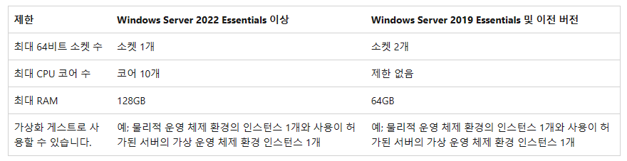 - Windows Server Essentials 2019버전과 2022버전의 차이점은 하드웨어 제한에서 차이를 보입니다.