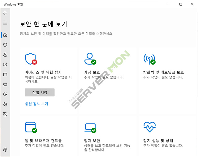 Windows Security에서는 바이러스 및 위협 방지, 백신 및 허위 파일 제거, 방화벽 및 보안 설정 관리 등