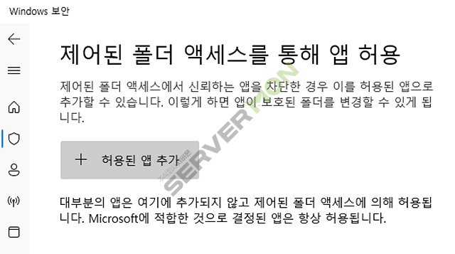사용자가 특정 앱을 보호 폴더 내 파일을 수정할 수 있도록 등록하려면 "제어된 폴더 액세스를 통해 앱 허용"