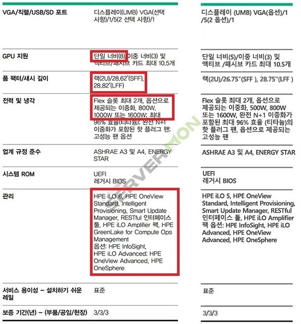 1. HPE ProLiant DL 360 (렉 타입, 인텔 기반) 변경사항