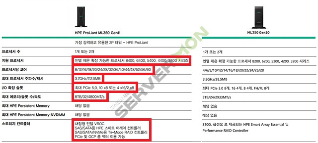 3. HPE ProLiant ML 350 (타워형, 인텔 기반) 변경사항