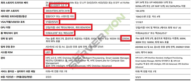 - 최대 내부 스토리지 : 368.64TB(15.36TB 24개) (Gen10 대비 약 2배 증가)