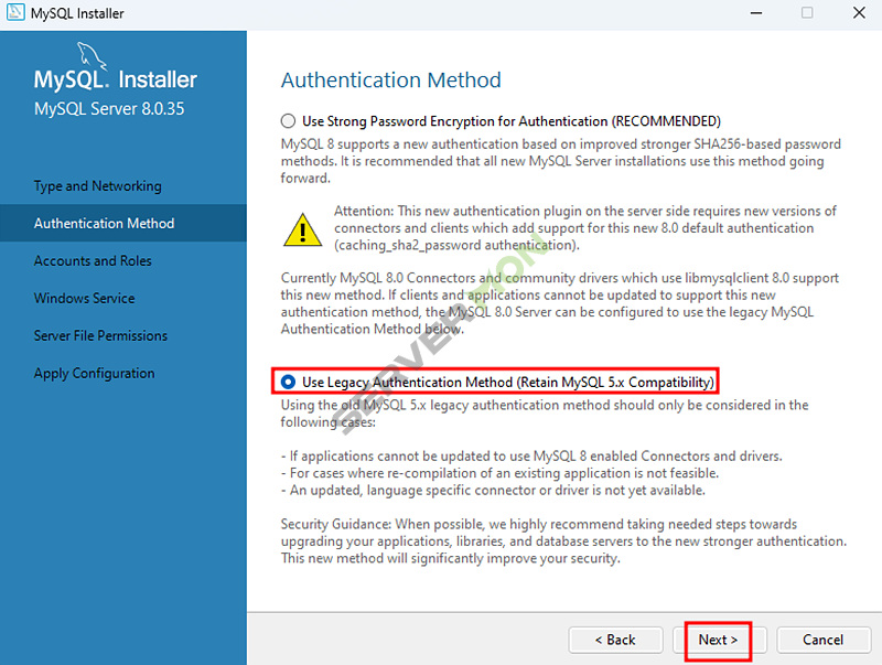 6. 추후 원활한 연동을 위해 Use Legacy Authenticcation Method 를 선택합니다.