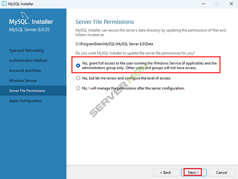 10. 파일 및 폴더 권한을 설정하는 화면입니다. 첫번째 선택 후 Next눌러줍니다.