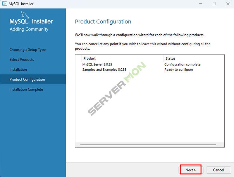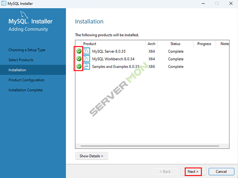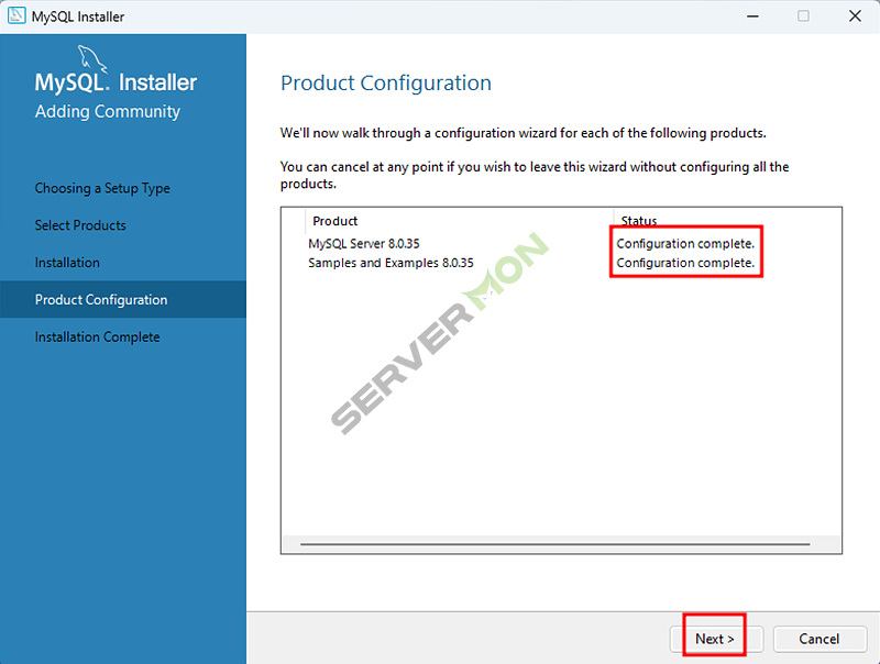 15. MySQL Server와 Samples and Examples Status값을 통해 모두 설치완료된것을 확인 후 Next를 눌러줍니다.