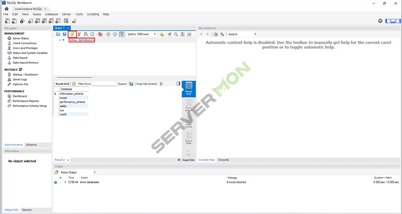 접속 이후 show databases 문구를 사용하여 정상적으로 Result Grid에 테이블이 출력된것을 확인합니다.
