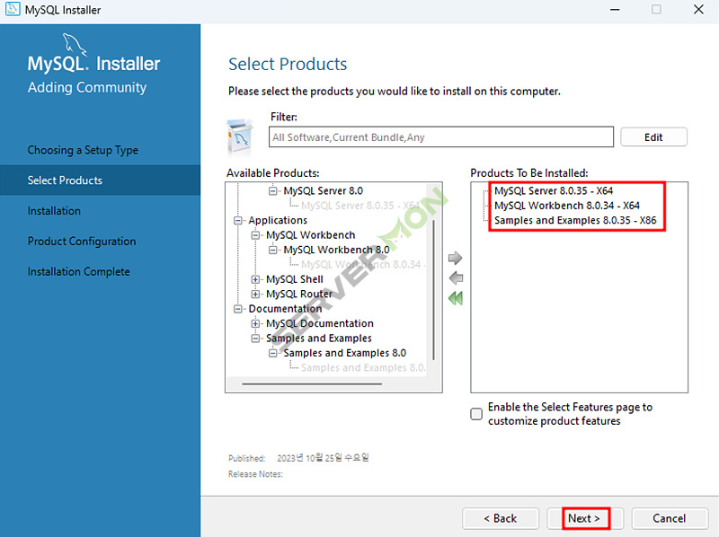 2. MySQL Server를 사용하기 위해 Server와 SQL과 통신을 위한 Workbench, 마지막으로 테스트를 위해 대량 DB샘플을 선택 후 Next를 해줍니다.