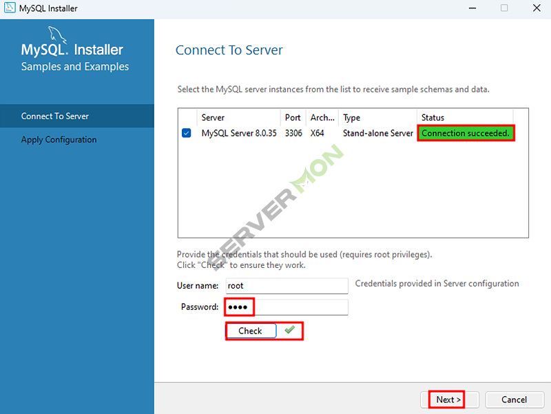 13. 7번에서 설정하였던 root Password를 입력해준 뒤 Check를 눌러줍니다. Status값이 Run -> Connection succeeded.로 변경이 되었다면 Next를 눌러줍니다.