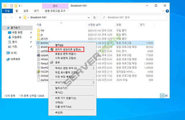 압축이 해제된 폴더에서 bcmnicfwupg 파일을 마우스 우클릭 후 관리자 권한으로 실행해 주세요.