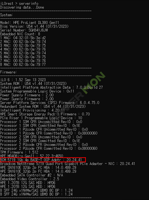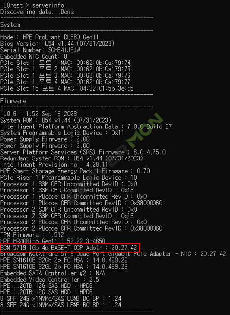 서버 재부팅 후 다시한번 ilorest 를 통해 BCM5719 이더넷의 버전확인을 합니다.