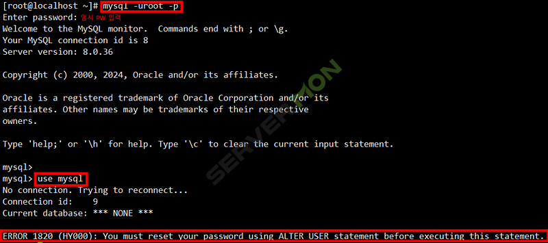 위에서 확인한 임시비밀번호로 mysql 접속을 합니다. 임시비밀번호로 접속한경우에는 MySQL의 관리자 권한을 사용할 수 없어 아래와같은 Error가 발생합니다. 비밀번호를 변경해줘야만 온전한 MySQL 관리자 권한을 사용할 수 있습니다.