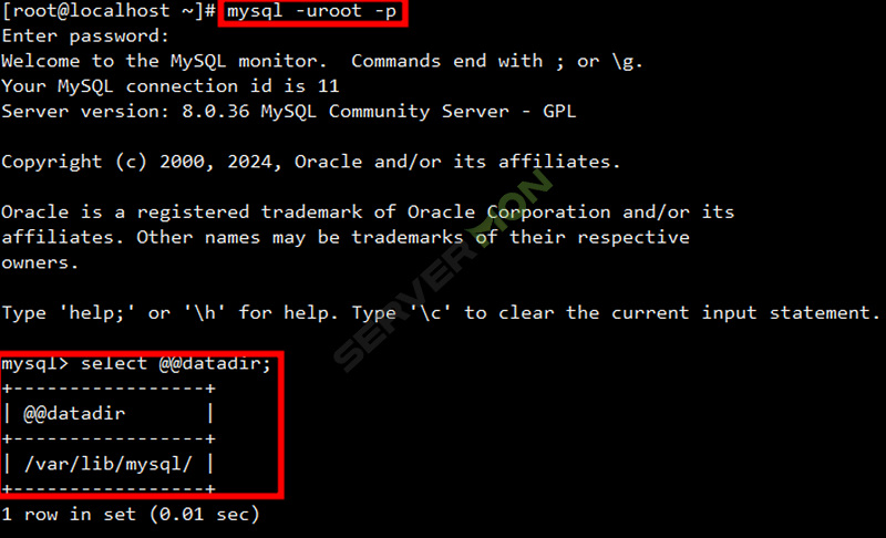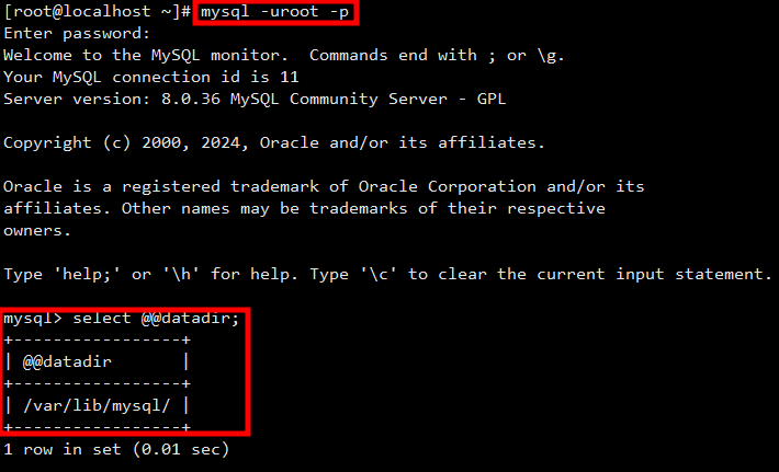 변경한 PW로 mysql 접속이 되는것을 확인하고, 추후 백업 및 데이터관리를 위해 mysql data가 쌓이는 경로도 확인해줍니다.