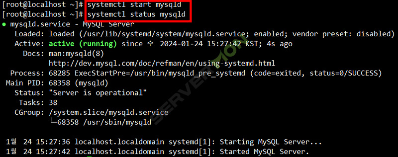 systemctl 명령어를 통해 mysql을 시작하고 active 상태가 되어있는지 상태확인까지 해줍니다.