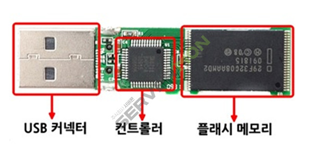 일반적인 USB 메모리는 반도체 저장장치인 플래시 메모리를 USB에 연결하여 사용하는 구조로
