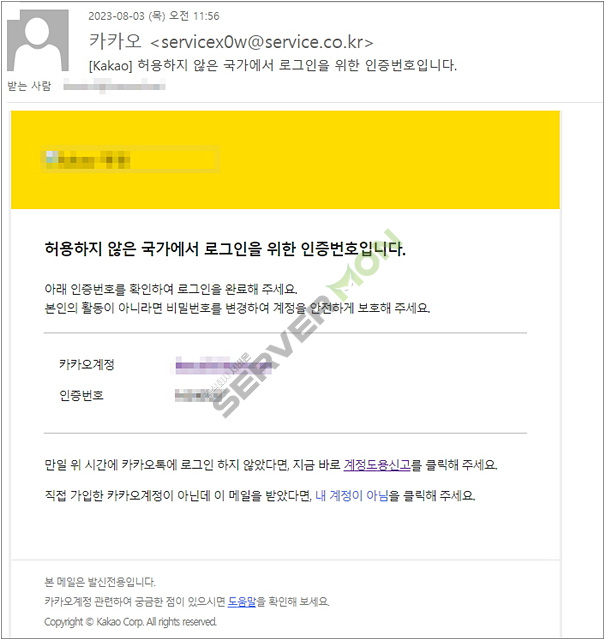 아래 사례는 카카오 인증 보안 관련 이메일인 것으로 위장하여 "계정도용신고", "내 계정 아님"의