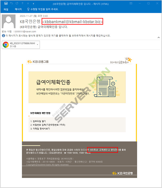 아래와 같이 금융기관을 사칭해서 급여이체 확인증인 것처럼 html 파일을 첨부하였습니다.