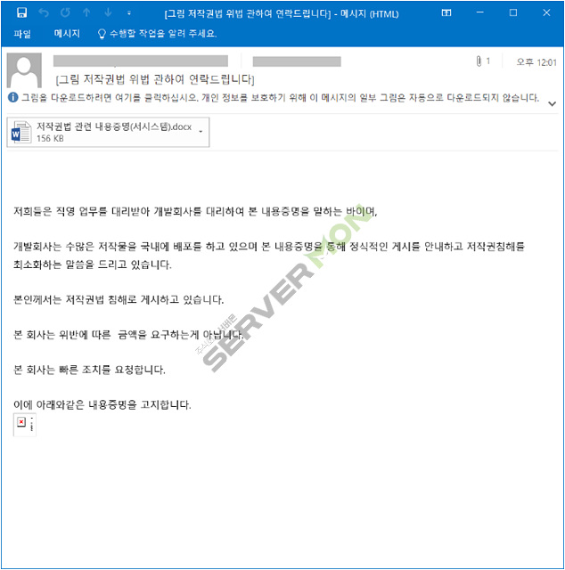 이외에도 워드 문서 파일을 첨부하고 견적 문의, 저작권 내용 증명 등의 내용으로 문서를 열어보도록