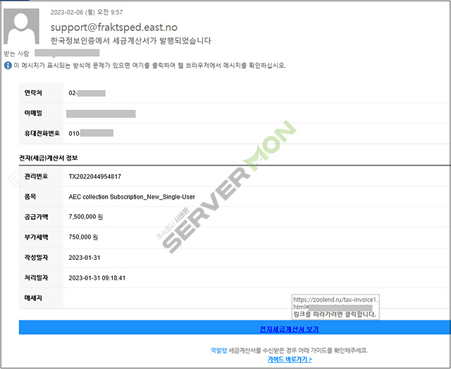 한국정보인증에서 세금계산서 발행 이메일인 것으로 위장하여 "전자세금계산서 보기" 링크의 클릭을