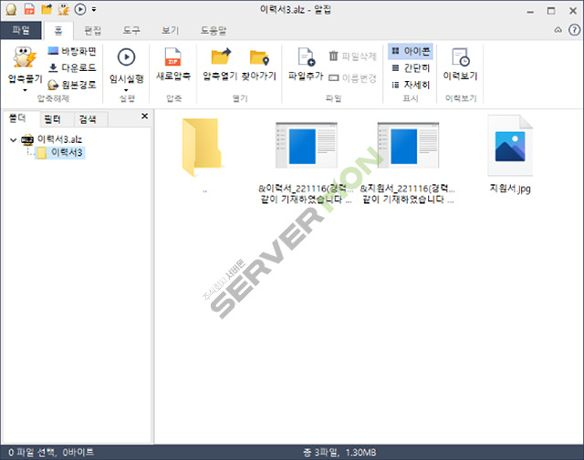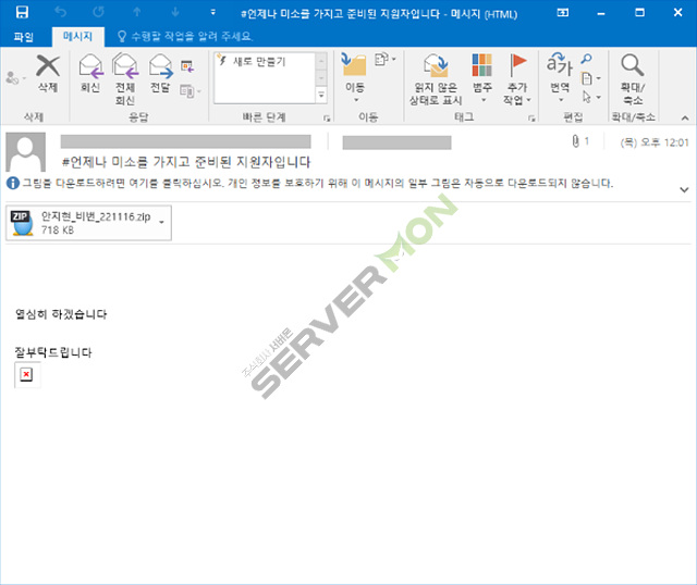 아래와 같이 입사 지원 서류인 것처럼 악성코드 파일을 압축하여 첨부한 사례가 있었습니다.