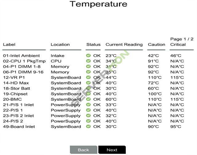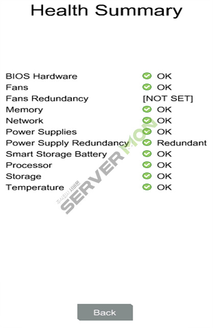 - 시스템 상태 - 상태 요약(BIOS 하드웨어, 팬, 온도, 배터리, 메모리, 네트워크 및 스토리지 상태), 팬(영역, 레이블, 상태 및 속도), 온도(레이블, 위치, 상태, 현재 판독값, 및 주의 사항), 전원 공급 장치(전원 공급 장치 요약 및 스마트 스토리지 배터리), 프로세서, 메모리, NIC 정보, 스토리지 및 펌웨어 정보.