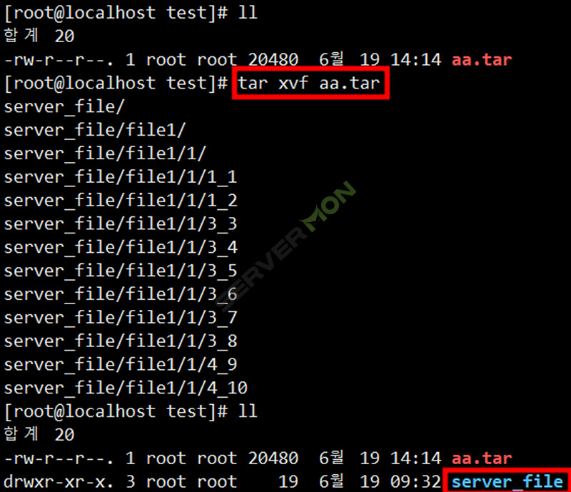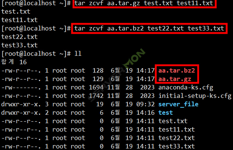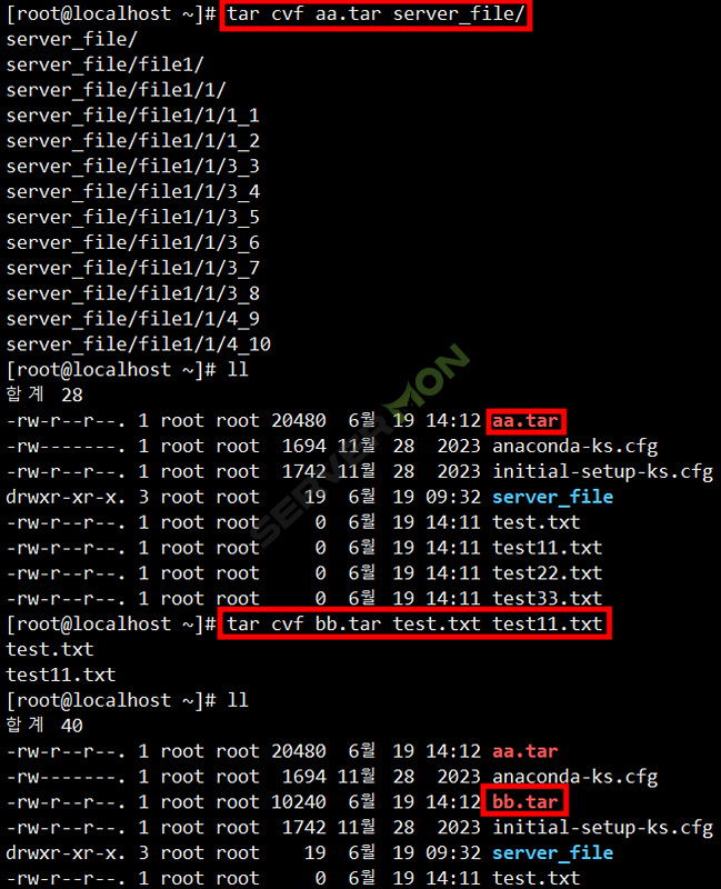tar은 용량변화없이 여러 개의 파일을 하나의 파일로 묶거나 풀 때 사용하는 명령어이다.