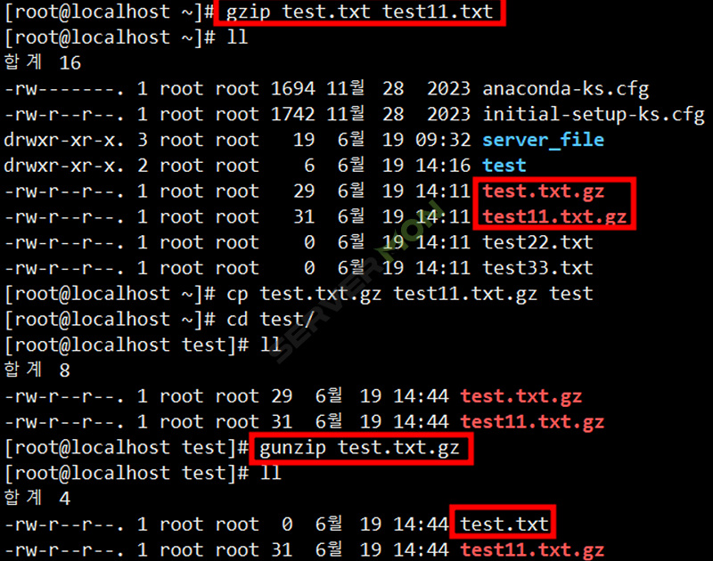 gzip 명령어는 GNU zip의 약어로 gzip 명령어를 통해 압축이 성공하면 기존 원본 파일은 모두 사라지고 .gz 확장자를 가진 파일을 새롭게 생성한다.