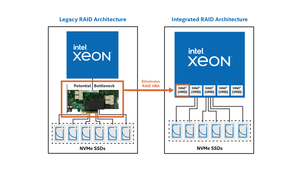 Intel VROC는 드라이브와 CPU 사이에 배치된 기존 하드웨어 RAID 호스트 버스 어댑터 카드의 복잡성, 비용 및 전력 소모 없는 이점을 제공합니다.