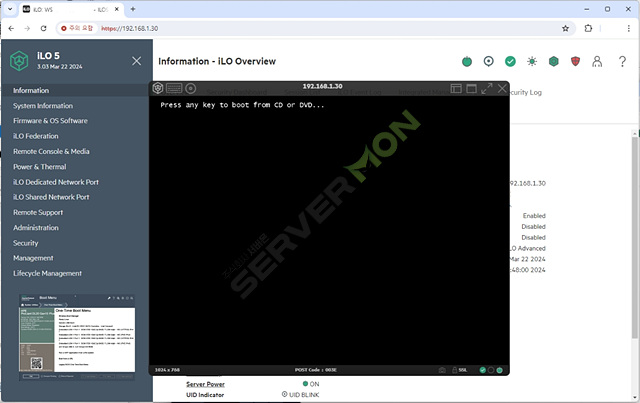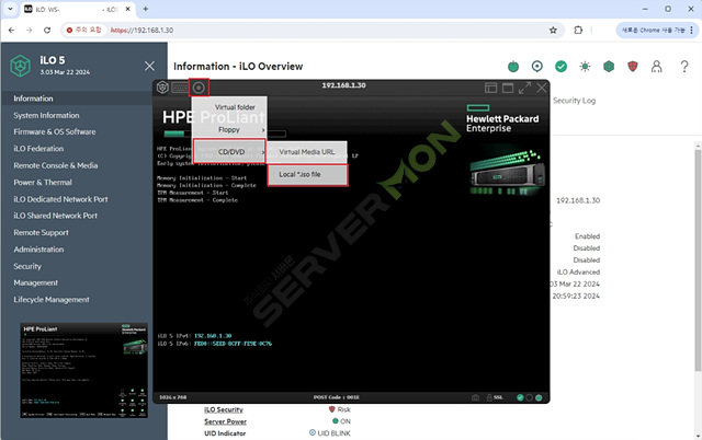 본 가이드에서 iLO 포트가 활성화가 되어 있고 iLO5 Web접속 가능한 상태여야만 합니다.