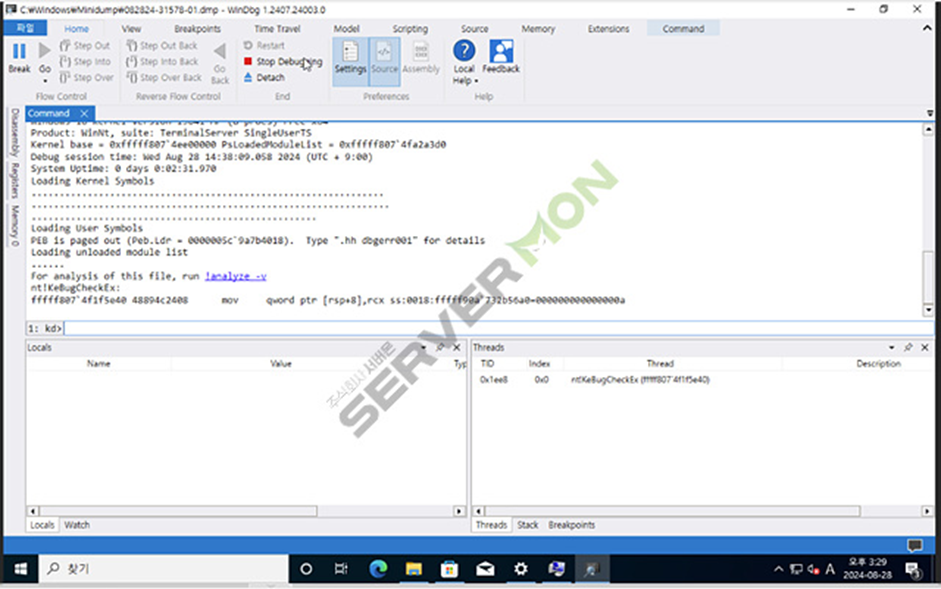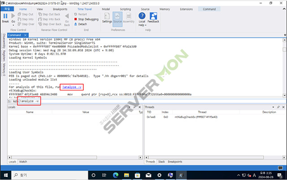 Dump파일 "!analyze- v" 기입 또는 클릭 진행합니다.