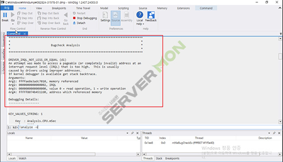 Dump파일 "!analyze- v" 기입 또는 클릭 진행합니다.