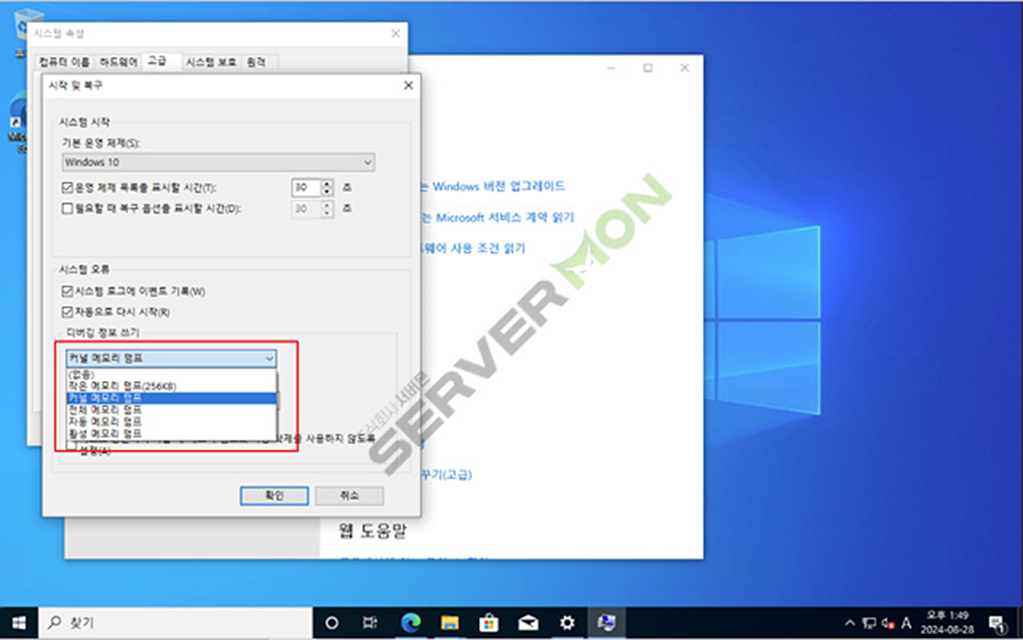 시스템 속성 -> 고급 -> 시작 및 복구 부분에 설정 클릭