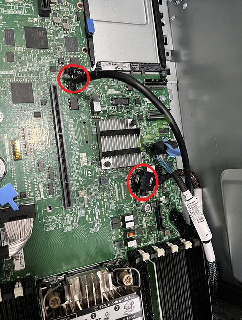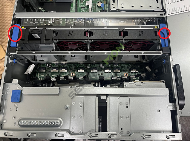 그림과 같이 fan cage와 riser cage를 제거 한 후, 메인보드에서 전면 I/0 케이블을 분리합니다.