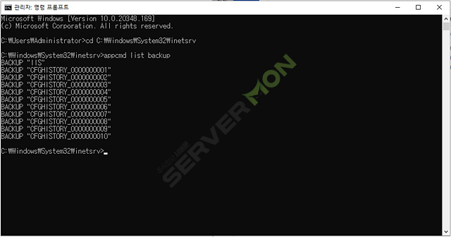 명령 프롬프트 창에서 appcmd list backup 입력하여 백업 리스트 확인합니다.