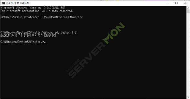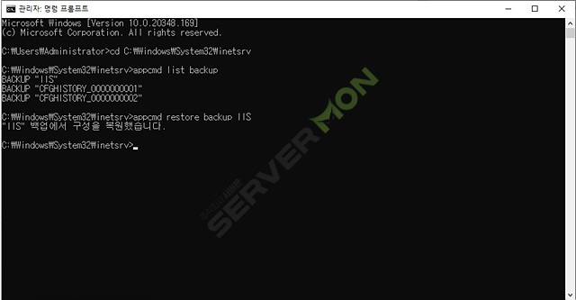 명령 프롬프트 창에서 appcmd restore backup IIS 입력 진행합니다. (C:\Windows\System32\intersrv – 경로 확인)