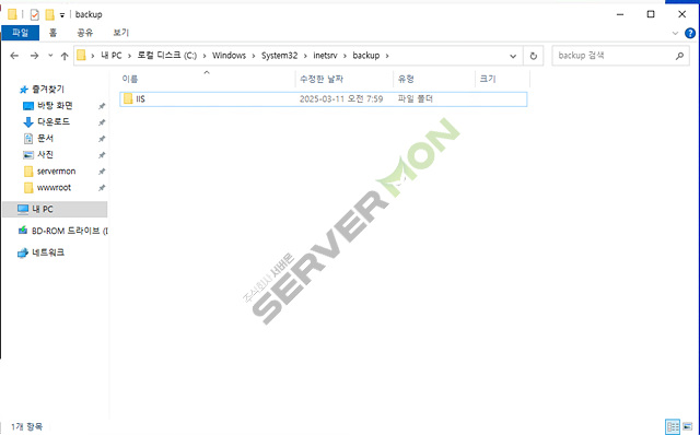 명령어 실행 후 C:\Windows\System32\intersrv 폴더 밑에 \backup\IIS 폴더가 생성되고 IIS 구성 파일이 백업됩니다.