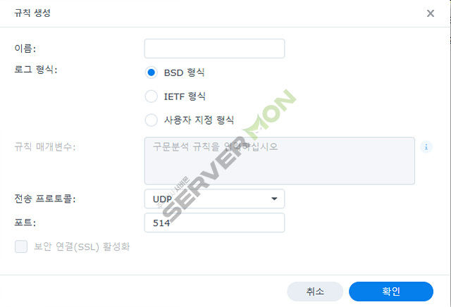 로그형식은 BSD / IETF 형식을 기본적으로 지원하고, 전송 프로토콜도 UDP가 기본값이지만 TCP도 지원이 됩니다.